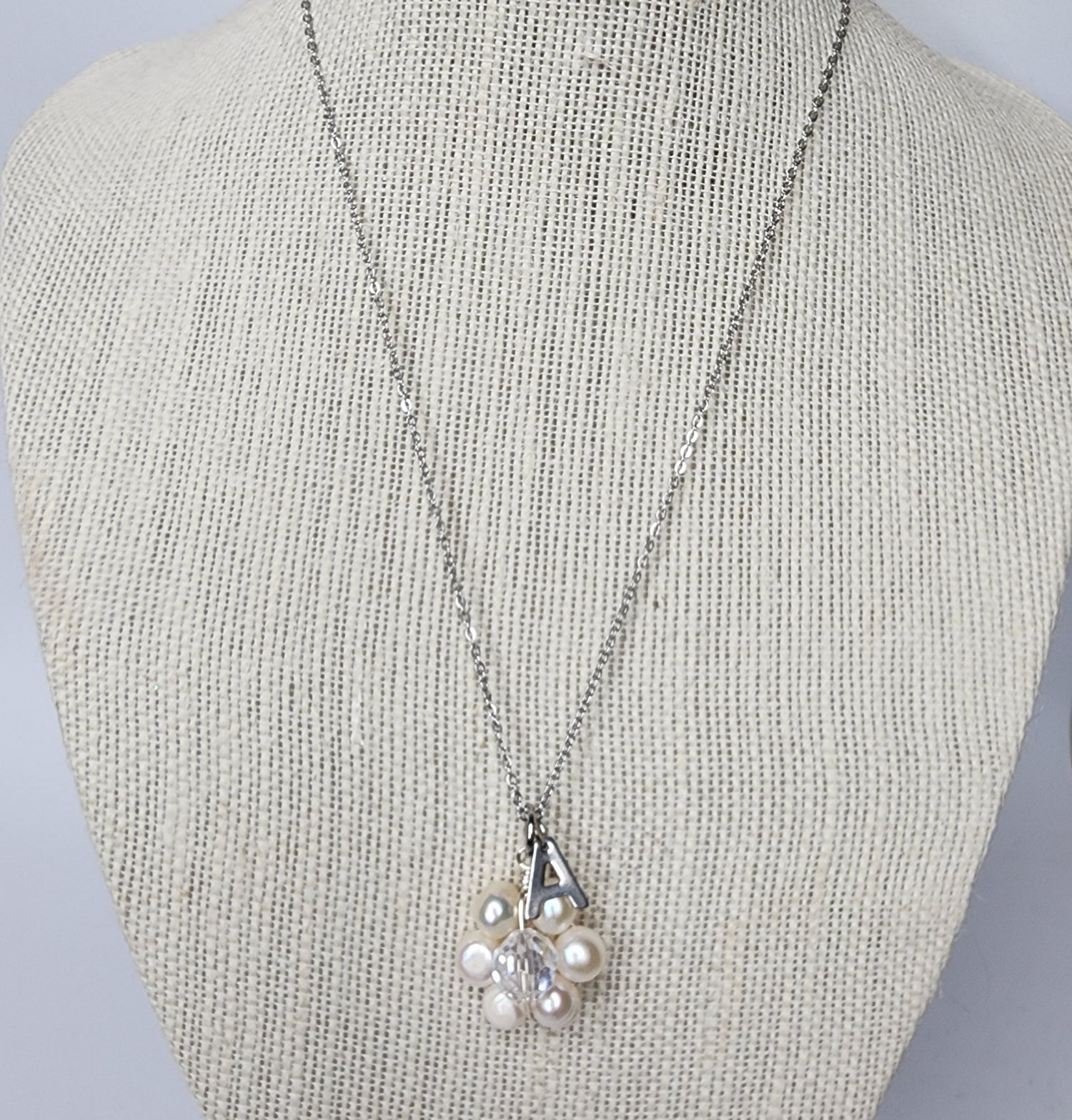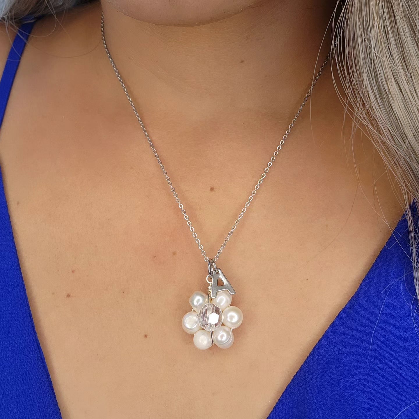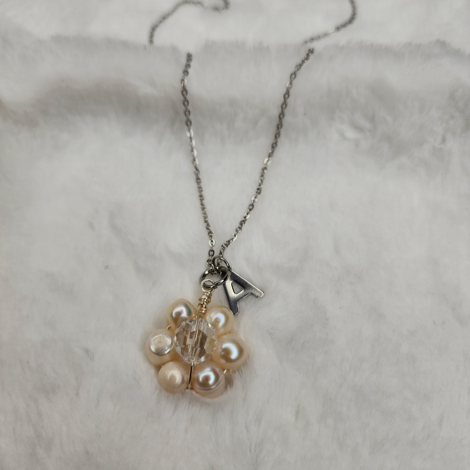 Flor hecha a mano con perlas cultivadas y cristal faceteado.