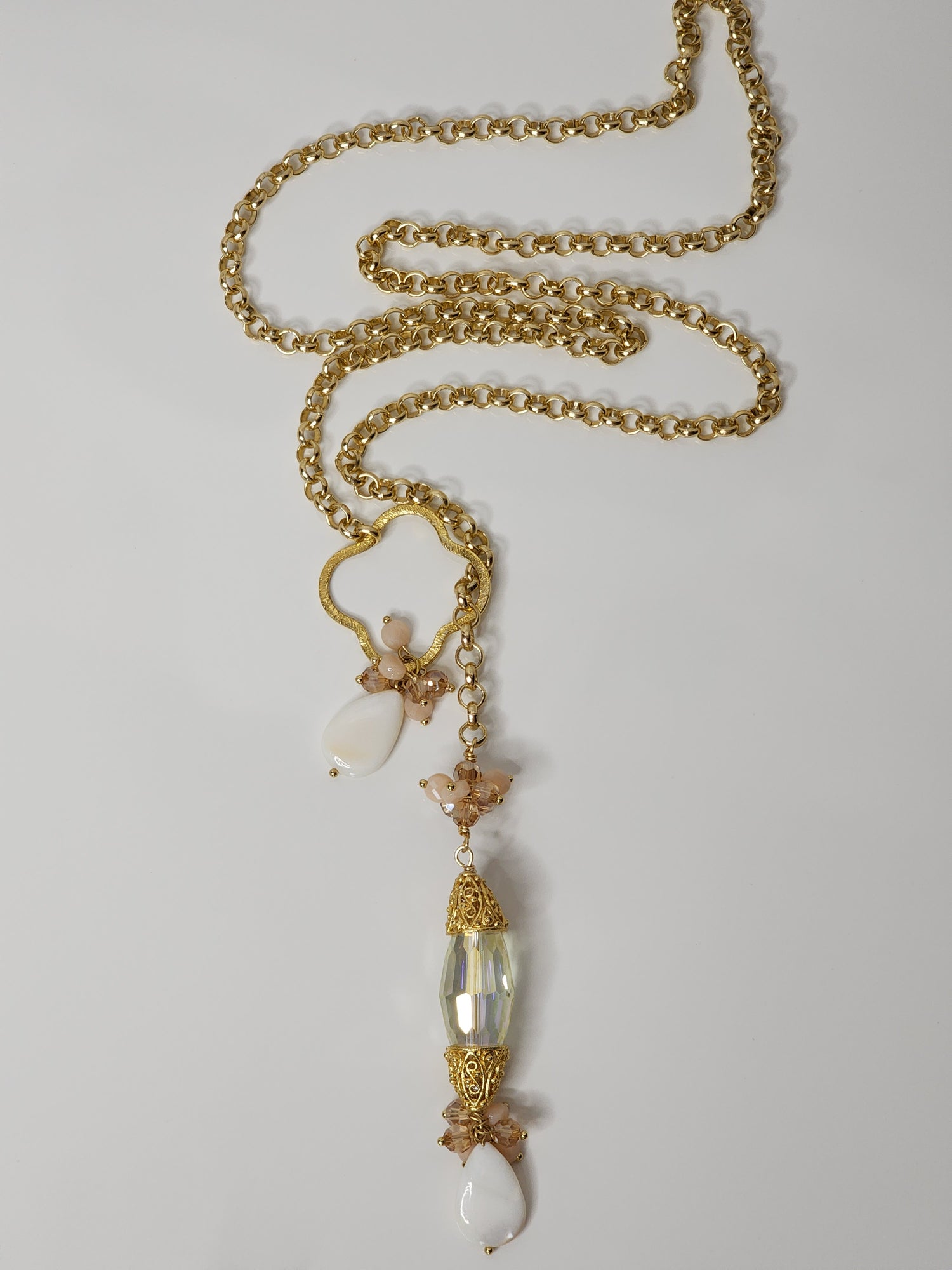 Collar largo estilo lariat. Color Dorado, cristal tornasol, con cristales beige. Madre perla en forma de gota. Perfecto para elevar tu estilo