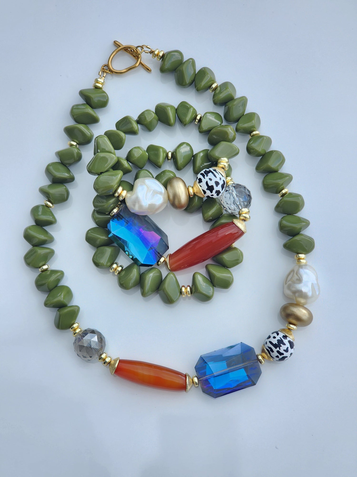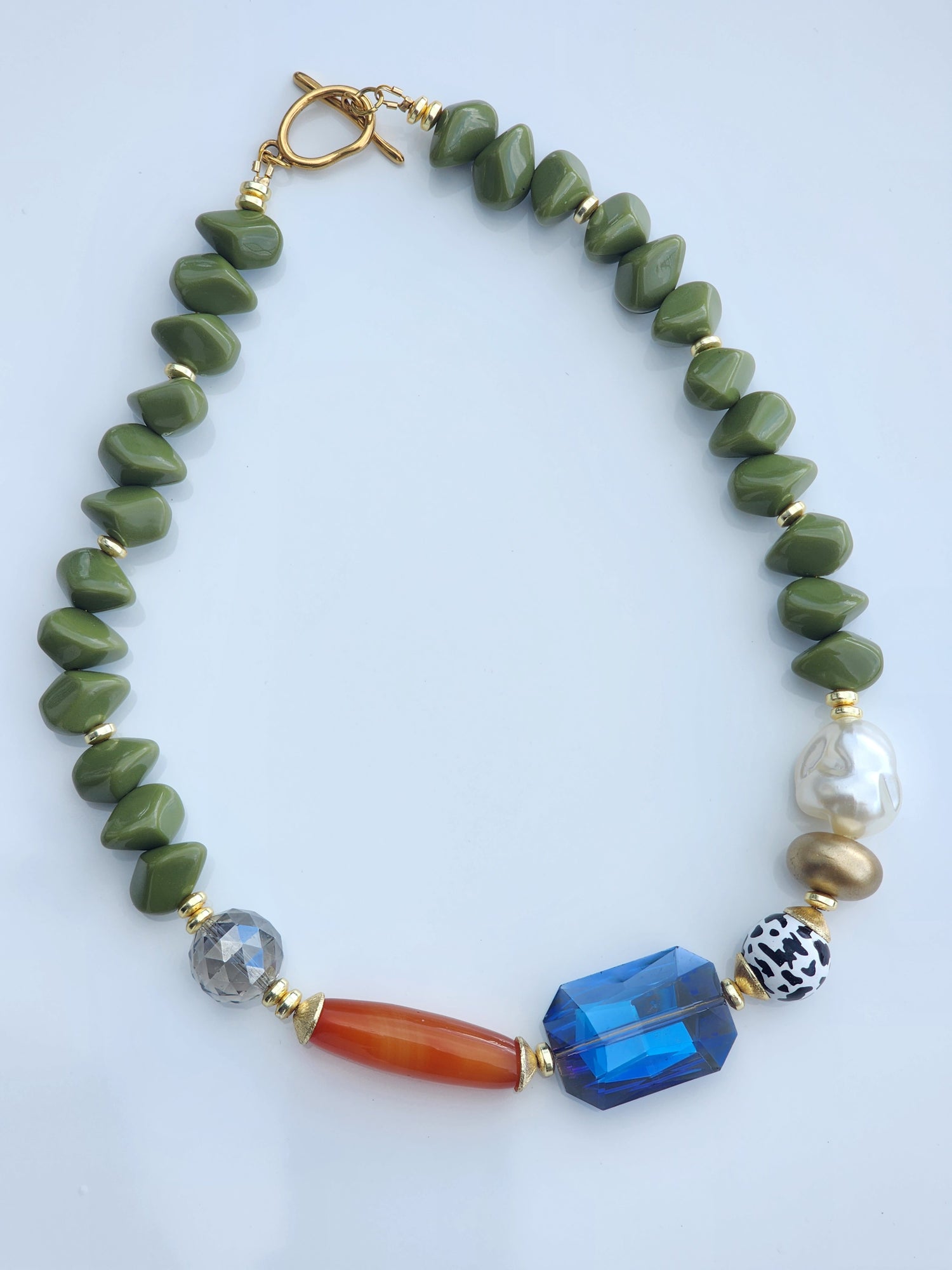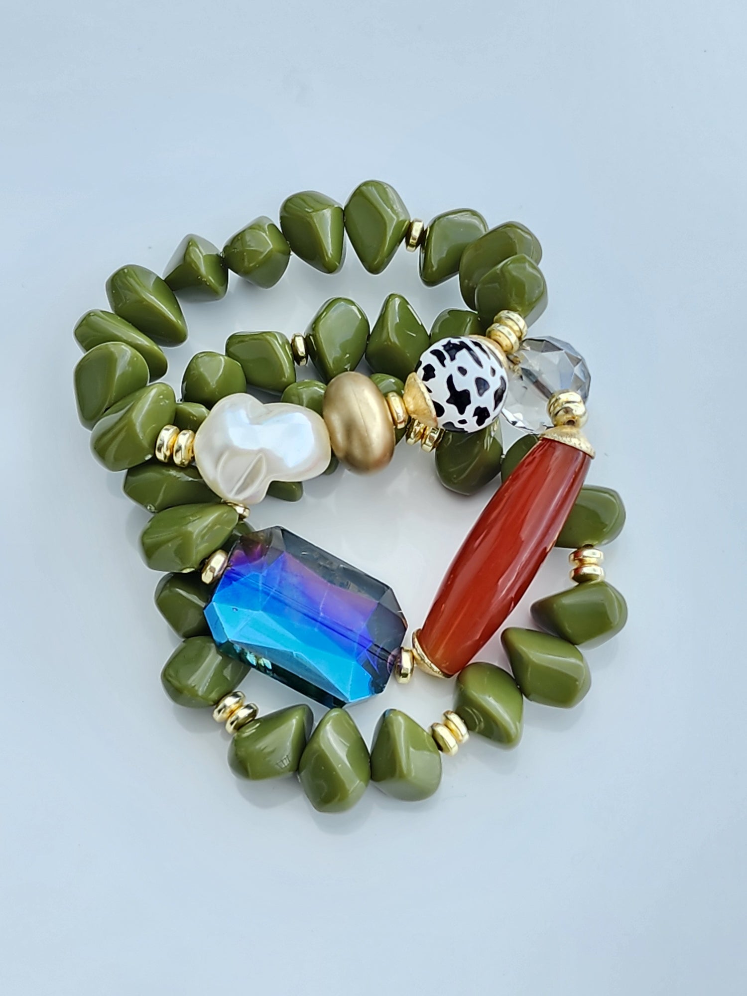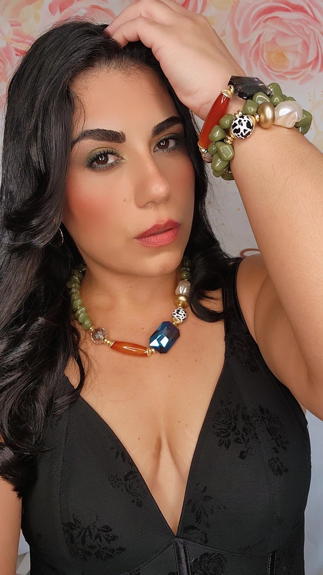 Collar y pulseras (set de 3) con colores otoñales. En diferentes materiales como acrílico, cristales y ágata.