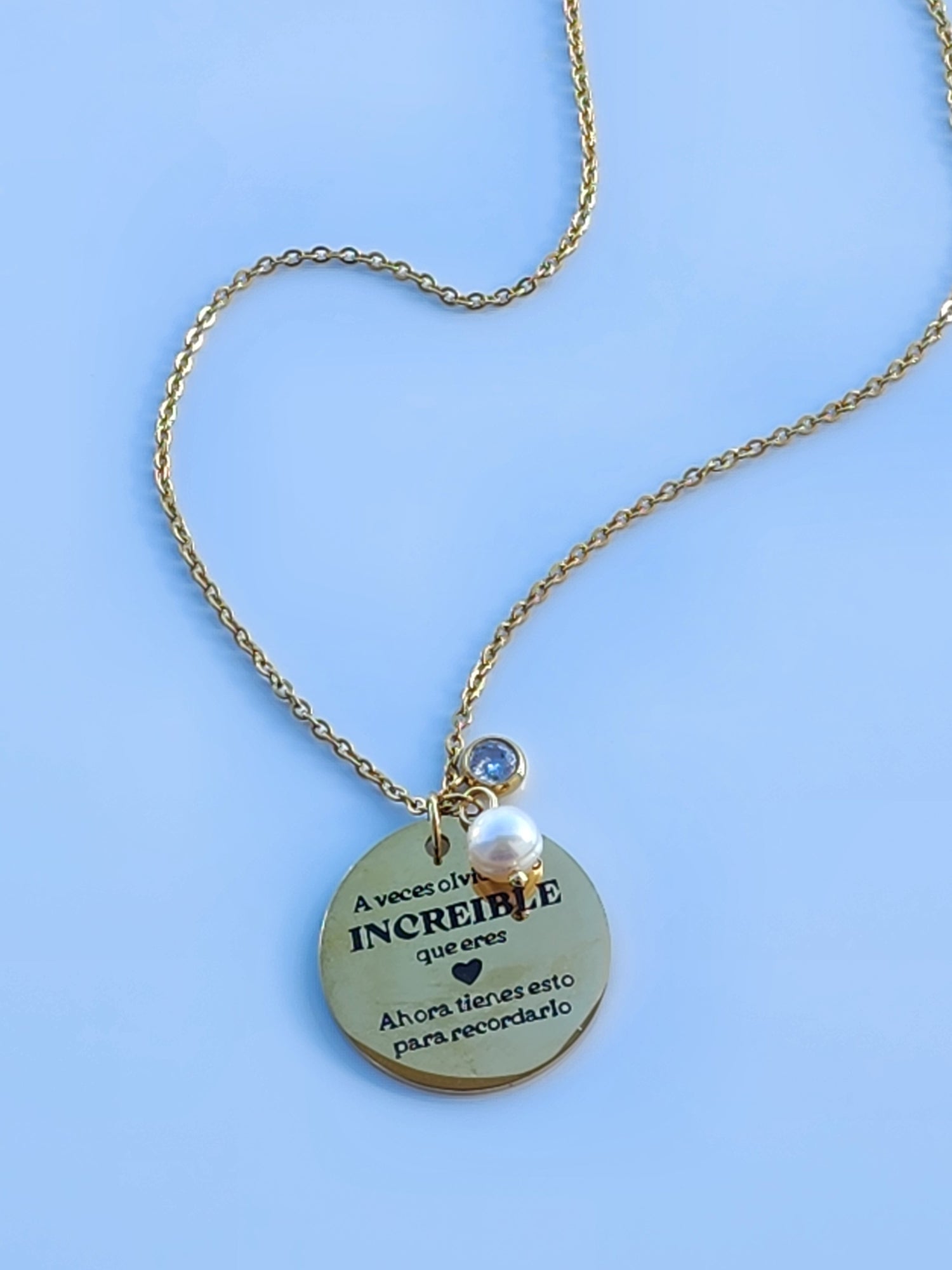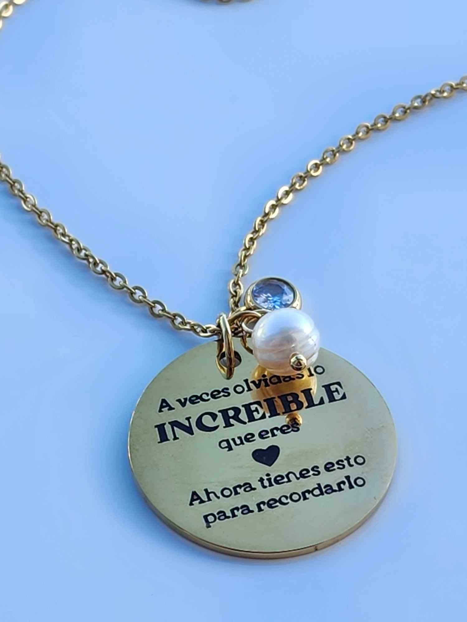 Collar en stainless steel. Charm con mensaje, perlas cultivada y rihstone.